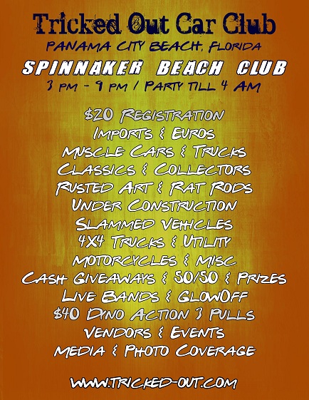 For 2011, we will have the nitrous kickin' with inside activities, and more food & drinks, more auto prizes, more GlowOff, more raffles, and more classes!! EOSS 2010 taught us many things as a club, and we are on course to bring something epic to Bay County in 2011! There will be door prizes, participants' prizes, and over 100 trophies geared to imports, domestics, euros, classics, luxury, exotics, hot rods, race cars, blown babies, under construction, 'stangs, 'vettes, specialty vehicles, trucks (hi & low), motorcycles and just about anything on wheels! We're also adding a few fun ones too, and will continue to expand these classes by each year's participant's attendance...so come on out and build this annual, fall automotive event happening on Panama City Beach (4th Saturday in September).